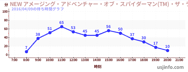 • NEW アメージング・アドベンチャー・オブ・スパイダーマン(TM)・ザ・ライド 4K3D$B$N(B2016年04月09日の待ち時間