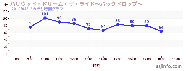 • ハリウッド・ドリーム・ザ・ライド〜バックドロップ〜$B$N(B2016年04月13日の待ち時間