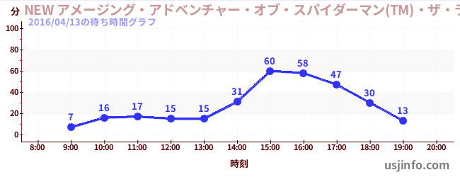 • NEW アメージング・アドベンチャー・オブ・スパイダーマン(TM)・ザ・ライド 4K3D$B$N(B2016年04月13日の待ち時間