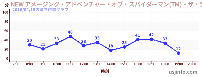 • NEW アメージング・アドベンチャー・オブ・スパイダーマン(TM)・ザ・ライド 4K3D$B$N(B2016年04月15日の待ち時間