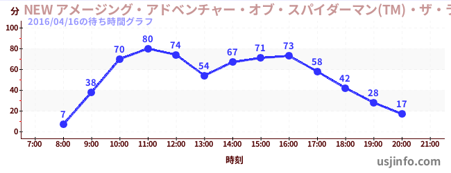 • NEW アメージング・アドベンチャー・オブ・スパイダーマン(TM)・ザ・ライド 4K3D$B$N(B2016年04月16日の待ち時間