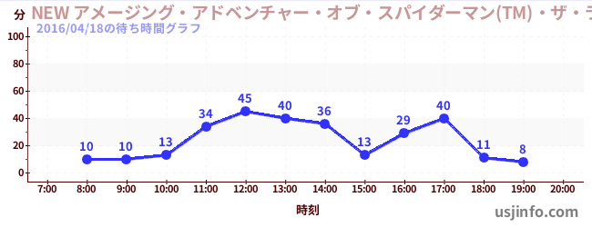 • NEW アメージング・アドベンチャー・オブ・スパイダーマン(TM)・ザ・ライド 4K3D$B$N(B2016年04月18日の待ち時間