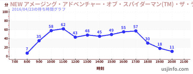 • NEW アメージング・アドベンチャー・オブ・スパイダーマン(TM)・ザ・ライド 4K3D$B$N(B2016年04月23日の待ち時間