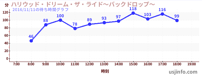 • ハリウッド・ドリーム・ザ・ライド〜バックドロップ〜$B$N(B2016年11月11日の待ち時間