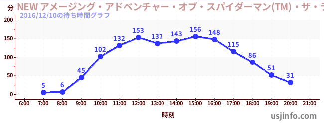 • NEW アメージング・アドベンチャー・オブ・スパイダーマン(TM)・ザ・ライド 4K3D$B$N(B2016年12月10日の待ち時間