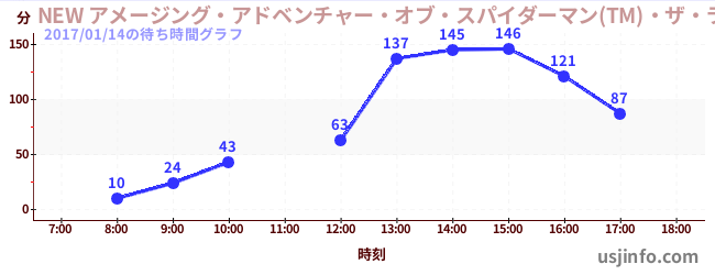 • NEW アメージング・アドベンチャー・オブ・スパイダーマン(TM)・ザ・ライド 4K3D$B$N(B2017年01月14日の待ち時間
