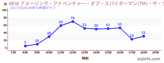 • NEW アメージング・アドベンチャー・オブ・スパイダーマン(TM)・ザ・ライド 4K3D$B$N(B2017年03月01日の待ち時間
