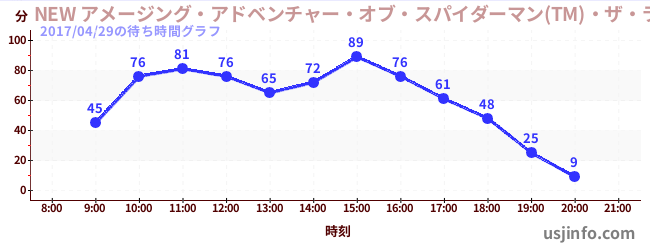 • NEW アメージング・アドベンチャー・オブ・スパイダーマン(TM)・ザ・ライド 4K3D$B$N(B2017年04月29日の待ち時間