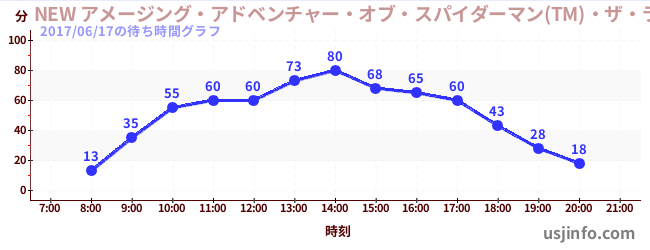 • NEW アメージング・アドベンチャー・オブ・スパイダーマン(TM)・ザ・ライド 4K3D$B$N(B2017年06月17日の待ち時間