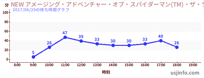• NEW アメージング・アドベンチャー・オブ・スパイダーマン(TM)・ザ・ライド 4K3D$B$N(B2017年06月29日の待ち時間