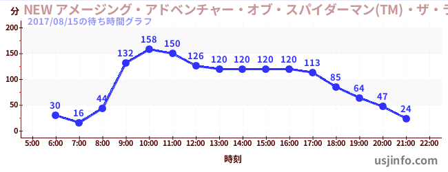 • NEW アメージング・アドベンチャー・オブ・スパイダーマン(TM)・ザ・ライド 4K3D$B$N(B2017年08月15日の待ち時間