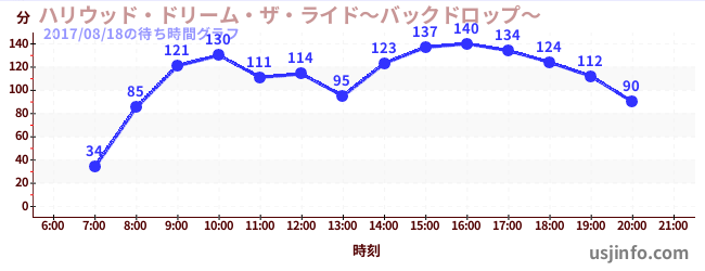 • ハリウッド・ドリーム・ザ・ライド〜バックドロップ〜$B$N(B2017年08月18日の待ち時間