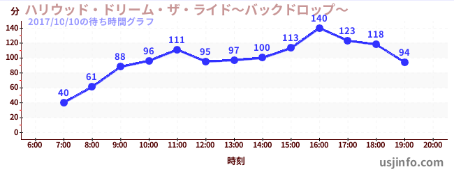 • ハリウッド・ドリーム・ザ・ライド〜バックドロップ〜$B$N(B2017年10月10日の待ち時間