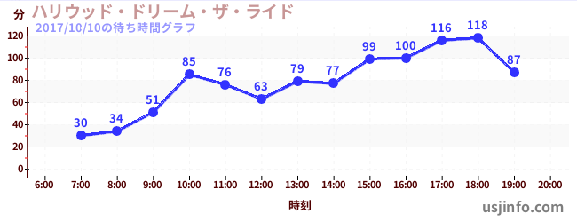 • ハリウッド・ドリーム・ザ・ライド$B$N(B2017年10月10日の待ち時間