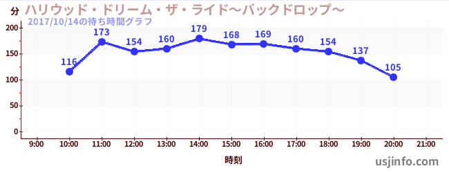 • ハリウッド・ドリーム・ザ・ライド〜バックドロップ〜$B$N(B2017年10月14日の待ち時間
