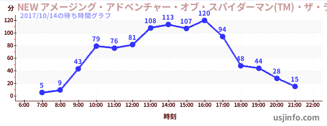 • NEW アメージング・アドベンチャー・オブ・スパイダーマン(TM)・ザ・ライド 4K3D$B$N(B2017年10月14日の待ち時間