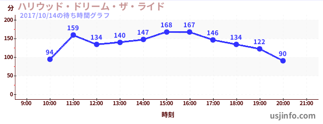 • ハリウッド・ドリーム・ザ・ライド$B$N(B2017年10月14日の待ち時間