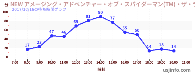 • NEW アメージング・アドベンチャー・オブ・スパイダーマン(TM)・ザ・ライド 4K3D$B$N(B2017年10月16日の待ち時間