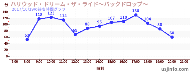 • ハリウッド・ドリーム・ザ・ライド〜バックドロップ〜$B$N(B2017年10月19日の待ち時間