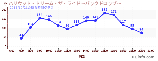 • ハリウッド・ドリーム・ザ・ライド〜バックドロップ〜$B$N(B2017年10月21日の待ち時間
