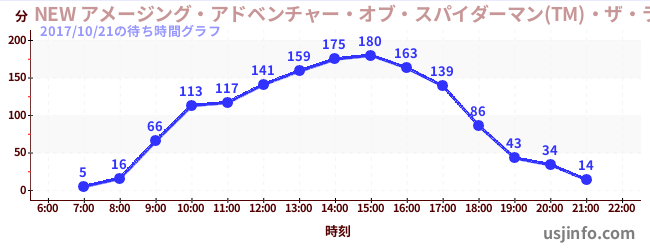 • NEW アメージング・アドベンチャー・オブ・スパイダーマン(TM)・ザ・ライド 4K3D$B$N(B2017年10月21日の待ち時間