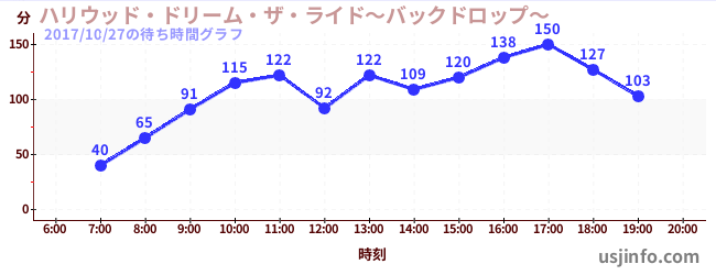 • ハリウッド・ドリーム・ザ・ライド〜バックドロップ〜$B$N(B2017年10月27日の待ち時間