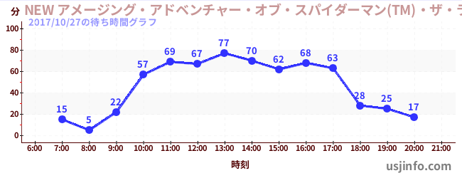 • NEW アメージング・アドベンチャー・オブ・スパイダーマン(TM)・ザ・ライド 4K3D$B$N(B2017年10月27日の待ち時間