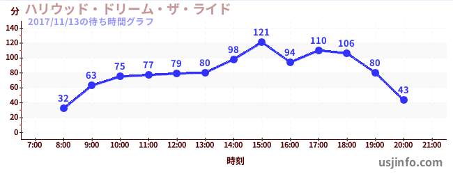 • ハリウッド・ドリーム・ザ・ライド$B$N(B2017年11月13日の待ち時間