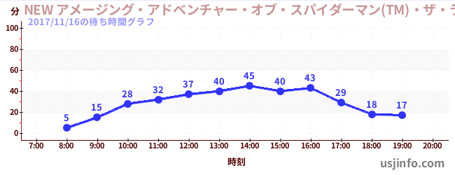 • NEW アメージング・アドベンチャー・オブ・スパイダーマン(TM)・ザ・ライド 4K3D$B$N(B2017年11月16日の待ち時間