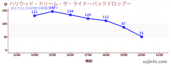• ハリウッド・ドリーム・ザ・ライド〜バックドロップ〜$B$N(B2017年11月18日の待ち時間
