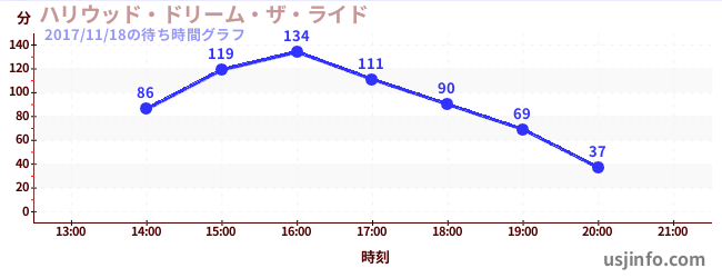 • ハリウッド・ドリーム・ザ・ライド$B$N(B2017年11月18日の待ち時間
