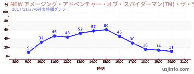 • NEW アメージング・アドベンチャー・オブ・スパイダーマン(TM)・ザ・ライド 4K3D$B$N(B2017年11月27日の待ち時間