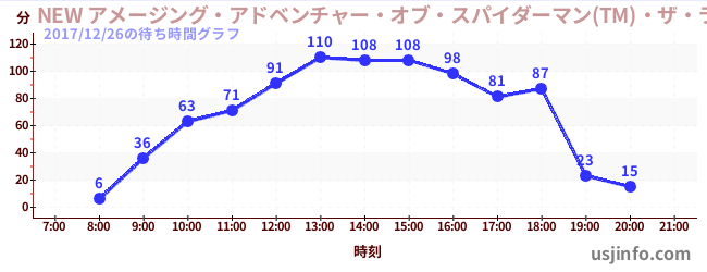 • NEW アメージング・アドベンチャー・オブ・スパイダーマン(TM)・ザ・ライド 4K3D$B$N(B2017年12月26日の待ち時間