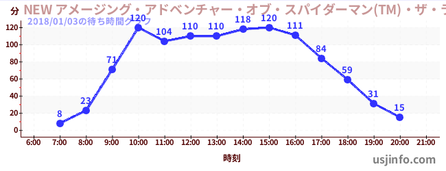 • NEW アメージング・アドベンチャー・オブ・スパイダーマン(TM)・ザ・ライド 4K3D$B$N(B2018年01月03日の待ち時間