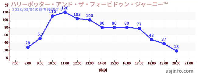• ハリーポッター・アンド・ザ・フォービドゥン・ジャーニー™$B$N(B2018年03月04日の待ち時間