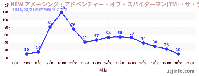 • NEW アメージング・アドベンチャー・オブ・スパイダーマン(TM)・ザ・ライド 4K3D$B$N(B2018年03月21日の待ち時間