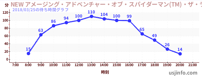 • NEW アメージング・アドベンチャー・オブ・スパイダーマン(TM)・ザ・ライド 4K3D$B$N(B2018年03月25日の待ち時間