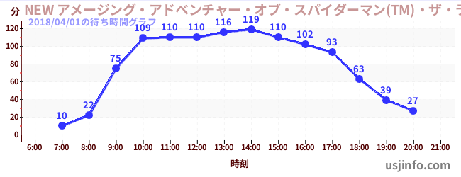 • NEW アメージング・アドベンチャー・オブ・スパイダーマン(TM)・ザ・ライド 4K3D$B$N(B2018年04月01日の待ち時間