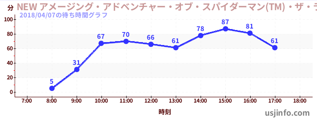 • NEW アメージング・アドベンチャー・オブ・スパイダーマン(TM)・ザ・ライド 4K3D$B$N(B2018年04月07日の待ち時間