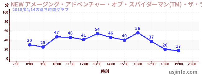 • NEW アメージング・アドベンチャー・オブ・スパイダーマン(TM)・ザ・ライド 4K3D$B$N(B2018年04月14日の待ち時間
