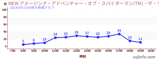 • NEW アメージング・アドベンチャー・オブ・スパイダーマン(TM)・ザ・ライド 4K3D$B$N(B2018年04月25日の待ち時間