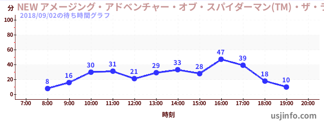 • NEW アメージング・アドベンチャー・オブ・スパイダーマン(TM)・ザ・ライド 4K3D$B$N(B2018年09月02日の待ち時間