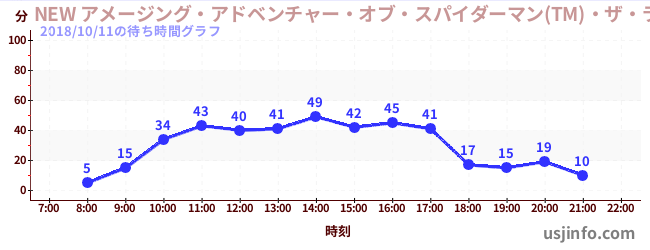 • NEW アメージング・アドベンチャー・オブ・スパイダーマン(TM)・ザ・ライド 4K3D$B$N(B2018年10月11日の待ち時間