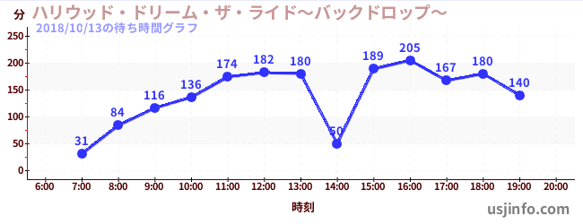 • ハリウッド・ドリーム・ザ・ライド〜バックドロップ〜$B$N(B2018年10月13日の待ち時間