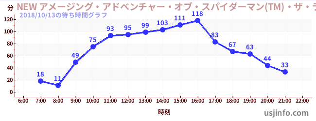 • NEW アメージング・アドベンチャー・オブ・スパイダーマン(TM)・ザ・ライド 4K3D$B$N(B2018年10月13日の待ち時間
