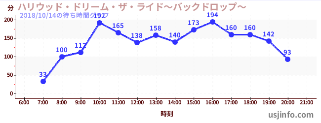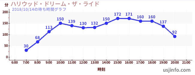 • ハリウッド・ドリーム・ザ・ライド$B$N(B2018年10月14日の待ち時間