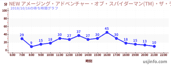 • NEW アメージング・アドベンチャー・オブ・スパイダーマン(TM)・ザ・ライド 4K3D$B$N(B2018年10月16日の待ち時間