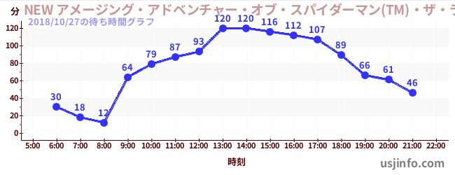 • NEW アメージング・アドベンチャー・オブ・スパイダーマン(TM)・ザ・ライド 4K3D$B$N(B2018年10月27日の待ち時間