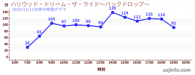 • ハリウッド・ドリーム・ザ・ライド〜バックドロップ〜$B$N(B2018年11月11日の待ち時間