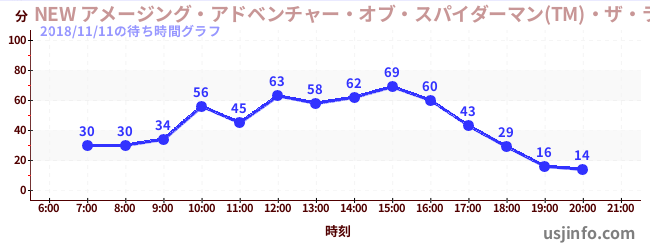 • NEW アメージング・アドベンチャー・オブ・スパイダーマン(TM)・ザ・ライド 4K3D$B$N(B2018年11月11日の待ち時間